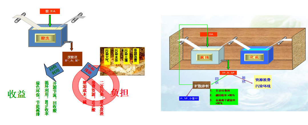 回收酸可用于新產(chǎn)品開發(fā),也可蒸發(fā)濃縮回用到前序生產(chǎn)過程中,大幅度降低廢酸排放量,減少了中和用堿的量,整個過程無新污染物排出,工藝綠色環(huán)保。