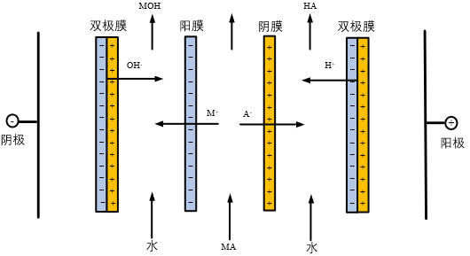 包括三隔室雙極膜電滲析器和二隔室雙極膜電滲析器兩種;三隔室雙極膜電滲析器適用于將無機鹽轉化為對應酸和堿,膜對由雙極膜、陽離子交換膜和陰離子交換膜組成,包含鹽室、酸室和堿室;二隔室雙極膜電滲析器適用于將有機酸鹽轉化為有機酸和堿或將有機堿鹽轉化為有機堿和酸,膜對由雙極膜和陽離子交換膜(包含料室和堿室)或雙極膜和陰離子交換膜(包含料室和酸室)。 雙極膜電滲析過程以電場為驅動力,利用雙極膜解離水為H+和OH-的特性,將雙極膜與陰、陽離子交換膜組合成雙極膜電滲析系統(tǒng), 實現(xiàn)將鹽溶液轉化為對應的酸和堿;該過程僅在電極室設置電極,僅在電極室產(chǎn)生氣體,運行能耗較低;該過程除電極室外,沒有電極反應,沒有氧化還原反應,不會產(chǎn)生目的物以外的物質。